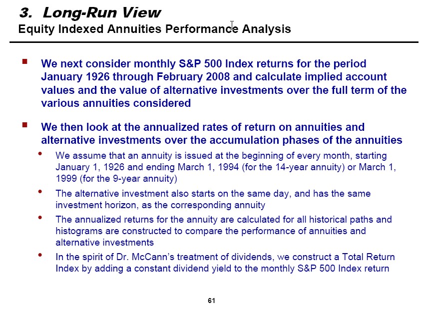 The following slides capture some of Professor Babbel's logic and argument around the statistical distribution of asset returns. Again, Professor Babbel's view is that it is not appropriate to assume that asset returns are normally distributed. As indicated in the slides above, this view has a significant impact on the comparative performance of the fixed indexed annuities over time.